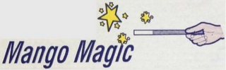 - DM0000: The mark consists of the words "Mango Magic" in blue appearing to the left of a depiction of a tan hand outlined in blue holding a wand in gray and white. Yellow stars with blue outlines appear at the end of the wand with one of the stars serving as a dot over the "i" in the word "magic".
