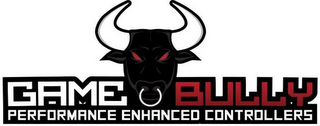 DM0000: The mark consists of the stylized words "GAME BULLY" with the word "GAME" in white and the word "BULLY" in red and both words are outlined by thick black lines; between the words "GAME" and "BULLY" is an image of a black bull head with gray shading, red eyes, white nose ring, and white horns outlined in black with gray shading; below the words "GAME BULLY" are the stylized words "PERFORMANCE ENHANCED CONTROLLERS" in white with black outlines; the color white in the background of the mark merely represents the background and is not claimed as a feature of the mark.