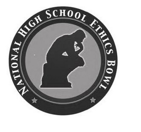 DM0000: The mark consists of the stylized words "NATIONAL HIGH SCHOOL ETHICS BOWL" circled around a silhouette of a man sitting on a rock in a thinking pose, with a circle around him inside a larger circle containing the words. There is a small five-pointed star before "NATIONAL" and after "BOWL".