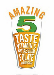 DM0000: The mark consists of the stylized wording "AMAZING 5 TASTE VITAMIN C POTASSIUM FOLATE NO SUGAR ADDED" and a design of a glass of orange juice. The word "AMAZING" appears above the top of the glass design in orange with a gray shadow; the number "5" appears within the top of the glass design in green with orange highlights and a black shadow; the wording "TASTE" appears within the top of the juice level of in the glass, with the wording "VITAMIN C" below that; "POTASSIUM" below that; "FOLATE" below that; and "NO ADDED SUGAR" inside the bottom of the juice. The glass design is gray, while the juice is orange in color. The white appearing in the mark, including in the wording "TASTE VITAMIN C POTASSIUM FOLATE NO ADDED SUGAR" is not a feature of the mark and represents transparency.