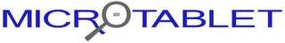 - DM0000: The mark consists of the word "MICROTABLET" in stylized capital letters, with the "O" appearing as a magnifying glass with a stylized character "-" in the center of the "O" portion of the magnifying glass. The letters "MICR" and "TABLET" are blue, and the magnifying glass and the stylized character "-" are grey. The color white represents transparent areas and is not claimed as a feature of the mark.