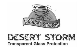 DM0000: The mark consists of a semi-circular design on which a banner appears at the bottom of the semi-circle. Inside the banner are the words "DESERT STORM". Imposed over the semi-circle is a cyclone or tornado design. Appearing below the design are the words "DESERT STORM", "Transparent Glass Protection".