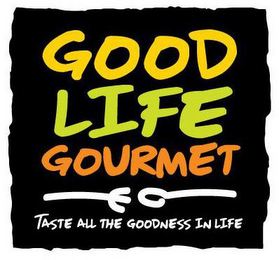 DM0000: The mark consists of the wording "GOOD" in yellow" LIFE" in green and "GOURMET" in orange in stylized font above the images of a fork and a spoon appearing in white. The wording "TASTE ALL THE GOODNESS IN LIFE" appears in white in stylized font underneath the images of the fork and the spoon. All of the foregoing elements of the mark appear on a square black background.