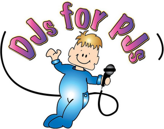 - DM0000: The mark consists of the words "DJS FOR PJS" in pink and purple letters outlined in black and yellow. Beneath the words is a stylized boy in blue pajamas outlined in black and with black details. The boy's skin is flesh with black facial features outlined in black. The boy has tan hair outlined in black. He is holding a black and gray microphone with a black cord.