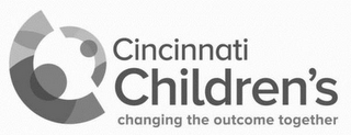 DM0000: The mark consists of two half circles, each with full circles at the center point. One half circle is larger, representing an adult figure and other half circle is smaller, representing a child figure. There is negative space between the figures. The words "Cincinnati Children's changing the outcome together" are located next to the design.