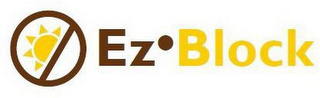 - DM0000: The mark consists of the stylized wording "EZ" appearing in brown followed by a brown dot and the stylized wording "BLOCK" appearing in yellow. To the left of "EZ" is a partial yellow sun design appearing in a brown circle outline with an angled brown line crossing within the circle. The white is not part of the mark and represents background area.