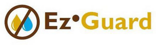 - DM0000: The mark consists of the stylized wording "EZ" appearing in brown followed by a brown dot and the stylized wording "GUARD" appearing in dark yellow. To the left of "EZ" is a brown circle outline with an angled brown line crossing within it. A dark yellow water drop design and a blue water drop design appear in the center of the circle. Each water drop has a small white stylized depiction of a reflection. The white inside each water drop is part of the mark, but the white outside of the water drops is not part of the mark and represents background area.
