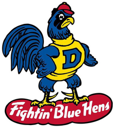 - DM0000: The mark consists of an image of a blue rooster wearing a yellow shirt bearing a blue letter "D" outlined in black. The rooster has a yellow beak and feet, a red comb, and white eyes. The rooster is standing on a red cloud-shaped field within which the wording "FIGHTIN' BLUE HENS" appears in white. A black border surrounds the image and accents its component parts.
