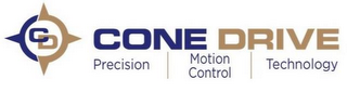 DM0000: The mark consists of the letter "C" in blue and "D" in gold in a blue and gold pointed circle resembling a compass followed by the word "CONE" in blue and "DRIVE" in gold, which are above the terms "Precision", "Motion Control" and "Technology" in blue separated by two gold vertical lines. The color white is not claimed as a feature of the mark and merely represents background or transparent areas.