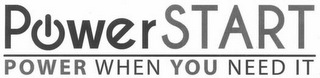 DM0000: The mark consists of the word "PowerSTART", underlined, in stylized font with the "o" in power being the universal symbol for power on, and the words "POWER WHEN YOU NEED IT" in all capital letters below the underlining.