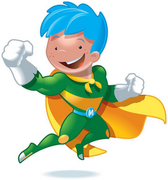 - DM0000: The mark consists of a male action hero with blue hair, blue eyebrows, peach-colored face and neck, black and gray eyes, white teeth, brown inside mouth, and red tongue wearing a green suit with yellow trim, with a yellow cape, yellow bandana, white and gray gloves, gray toes, and a blue belt with the letter "M" in the color white shown on the belt buckle.