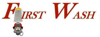 - DM0000: The mark consists of the stylized wording "FIRST WASH" in red; a yellow showerhead design is under letter "F" with stylized gray steam and black water drops spraying from the showerhead; a stylized design of a fireman is under the shower with a red helmet with a gray and tan nameplate and yellow top on the top of the helmet; the fireman is wearing a gray and black breathing mask and the fireman's skin is tan with black eyes; the color white is not claimed as a feature of the mark and merely represents the background.