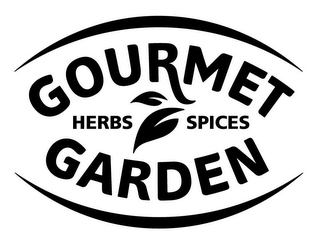 DM0000: The mark consists of Two semi-oval arched lines above and below the words "GOURMET" and "GARDEN" respectively. In the center of the mark are the words "HERBS" and "SPICES" separated by an image to two leaves,.