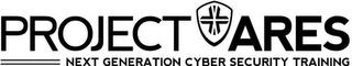 DM0000: The mark consists of a shield shape between the words "PROJECT ARES". Within the shield is the design of a plus symbol formed of "V"s that are all oriented differently and pointing to the center of the design. The words "NEXT GENERATION CYBER SECURITY TRAINING" and two horizontal lines are below the words "PROJECT ARES" and the shield shape.
