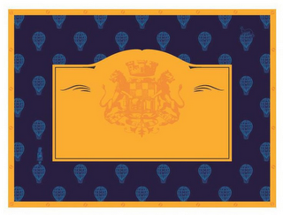 - DM0000: The mark consists of an overall rectangular design with an orange banner bearing a dark orange coat of arms design with a black border and three curved black lines on either side of the coat of arms, all on a blue background with a pattern of light blue hot air balloon designs, one on the lower left with the design of a female holding a tablet in light blue, with an orange border incorporating dark orange double chevron designs.