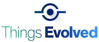 - DM0000: The mark consists of the words "THINGS EVOLVED" with initial capital letters.The letter "T" in "THINGS" is greenish-blue and each succeeding letter is a shade blue darker. The letter "E" in "EVOLVED" is dark blue and each succeeding letter is a shade blue lighter. The word "EVOLVED" is in bold lettering. A design element is located above the words "THINGS EVOLVED" and consists of a blue dot with a shaded contrail. The blue dot is located between two horizontal counter-facing hook devices.