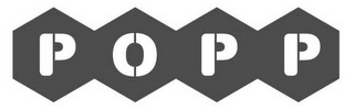 - DM0000: The mark consists of The mark consists of the word "POPP" in a stylized font positioned inside of four hexagons.