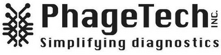 DM0000: The mark consists of a simplified stylized bacteriophage bisected vertically down the center. On the right of the image are the literal elements, "PHAGETECH INC. SIMPLIFYING DIAGNOSTICS" where the "INC" is placed vertically on the end of the first row of the literal elements.