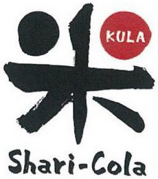 - DM0000: The mark consists of a stylized Japanese character in black, except the circle located at the upper right corner is in red and contains the stylized wording "KULA" inside; all of which is above the stylized wording "SHARI-COLA" in black. The color white in the drawing represents background or transparent areas, and is not claimed as a feature of the mark.