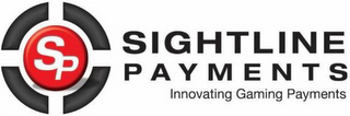 DM0000: The mark consists of the lettering "SP" in white presented in a red and dark red shaded circle. The circle is surrounded by four gray curved bands. To the right of the circle and curved bands is the wording "SIGHTLINE PAYMENTS INNOVATING GAMING PAYMENTS" in black. All of the foregoing is displayed against a white background.