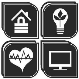 - DM0000: The mark consists of four squares, each with two rounded corners and shadow lines appearing along each left and top side of said squares, with the upper left square containing the representation of a padlock with a roof and chimney appearing over same; the lower left square containing the representation of a heart with a horizontal line crossing same and a jagged line representing a heartbeat; the upper right square containing the representation of a light bulb within which appears a stem with three leaves; and the lower right square containing the representation of a computer monitor.