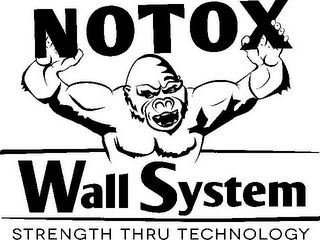 DM0000: The mark consists of the upper portion of a gorilla holding up the word "NOTOX". The words "WALL SYSTEM" are below the gorilla and the words "STRENGTH THRU TECHNOLOGY" are below the words "WALL SYSTEM. There are horizontal lines on both sides of the gorilla above the words "WALL SYSTEM" and there is a horizontal line below the words "WALL SYSTEM".