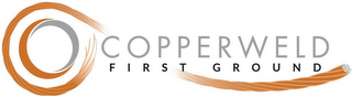 DM0000: The mark consists of the wording "COPPERWELD" in the color gray and the wording "FIRST GROUND" in the color black, with the wording "FIRST GROUND" directly below the wording "COPPERWELD". To the left of the wording is a stylized depiction of a gray and copper color coil of copperclad stranded cable wire that is unwinding in a clockwise direction and extending to the right above, behind, and below the wording in the mark. Inside of the coiled wire are two concentric and intertwined "C"s, from left to right, are in the colors copper and gray. The color white represents background and is not a part of the mark.