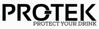 DM0000: The mark consists of THE WORDS "PRO-TEK PROTECT YOUR DRINK" WHERE THE DASH BETWEEN "PRO" AND "TECH" IS OVERLAID ONTO THE "O" IN "PRO" AND THE WORDS "PROTECT YOUR DRINK" ARE POSITIONED BELOW AND IN SMALLER LETTERS THAN THE WORD "PRO-TEK".