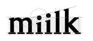 - DM0000: The mark consists of the letters "miilk" with the letters progressively increasing in height. Each letter is bounded by vertical and horizontal lines with a repeating pattern of angled lines extending behind the letters. Two smaller dashed circles are disposed on the face of the letter "m" while a larger dashed circle is disposed over the face of the letters "ii". A single angled line extends across the top of the letters "iilk".
