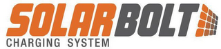 DM0000: The mark consists of the word "SOLAR" in all orange, bubble-style caps, followed by the word "BOLT" in all grey, bubble-style caps, followed by a slanted 4-across by 4-down grid of rounded-corner rectangles with the left-hand row of rectangles appearing in orange, and fading to grey rectangles on the right-hand row of rectangles. The words "CHARGING SYSTEM" appear in all grey caps below the word "SOLAR".