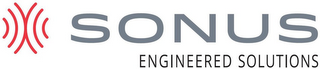 DM0000: The mark consists of a design element in red comprised of three curved lines facing left connected to three curved lines facing right followed by the word "SONUS" in grey stylized font above the words "ENGINEERED SOLUTIONS" in black.