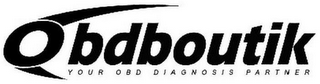 DM0000: The mark consists of the stylized word "Obdboutik". The top and bottom of the first letter "O" in "Obdboutik" features a triangle with curved sides extending to the right. The top triangle is larger than the bottom triangle. Below "Obdboutik" in smaller stylized lettering is the slogan "YOUR OBD DIAGNOSIS PARTNER".
