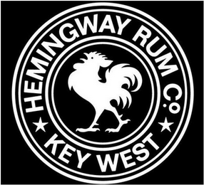 DM0000: The mark consists of the wording "HEMINGWAY RUM Co." and wording "KEY WEST" in concentric circles with stylized rooster in center of circle. The black box that appears in the drawing represents background and is not a part of the mark.