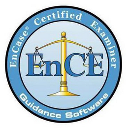 DM0000: The mark consists of a gold justice scale with "EnCE" super-imposed in dark blue print over it -- both inside a lighter blue circle with a black boarder. A ring of dark blue runs the perimeter of the light blue circle and, in white print, is "EnCase Certified Examiner" and "Guidance Software".
