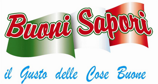 DM0000: The mark consists of the stylized red wording "BUONI SAPORI" with a white border inside a green border on top of curved green, white, and red rectangles with white glare representing a stylized Italian flag above the blue stylized wording "IL GUSTO DELLE COSE BUONE". There is greyish shading at the bottom of the flag.