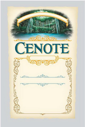 - DM0000: The mark consists of the wording "CENOTE" in a stylized font with the letters in teal with turquoise highlights and gold shadowing. Above the wording is an image of a waterfall with stones in gray and black shadowing between the stones, greenery in light green, green and dark green on the stones and white water falling into a body of water that is turquoise and fades to light blue and white. A banner in light beige and outlined in gold appears in a downwards arc at the top of the image. At the bottom of the image and immediately above "CENOTE" is a scroll design in gold. Below "CENOTE" is a square created by scroll designs with the scroll at the top of the square in gold and the sides and bottom in dark gold. In the middle of the square design are two horizontal scroll designs in silver. The entire mark is on a rectangular light beige background with a wide gray border.