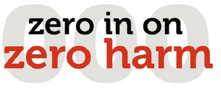 - DM0000: The mark consists of the wording "ZERO IN ON" in lowercase stylized black font above the wording "ZERO HARM" in lowercase stylized red font. The number "000" is shown in large grey font in the background behind "ZERO IN ON" and "ZERO HARM". The color white shown in the drawing represents transparent background areas and is not part of the mark.