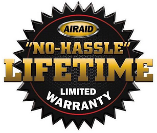DM0000: The mark consists of a serrated black circle, with a red inner circle and a gray honeycomb design contained within the red circle. Positioned at the top of the black circle is the term "AIRAID" in black capitalized letters that are outlined in white, located in the middle of a solid yellow oval that is positioned under a silver open oval that casts a shadow over the yellow oval. Positioned over the middle of the black circle is the phrase "NO-HASSLE", and below is the word "LIFETIME", all of which are in yellow block letters, with "LIFETIME" extending beyond the outer edge of the black circle. Positioned at the bottom of the black circle is the word "LIMITED", with the word "WARRANTY" appearing below and in an arcuate shape, both of which are in block white letters.