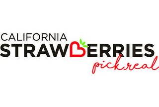 DM0000: The mark consists of the word "CALIFORNIA" in black, above the stylized word "STRAWBERRIES", also in black featuring a red strawberry with a green stem as the letter "B" in "STRAWBERRIES". The words "PICK REAL" are below "STRAWBERRIES" in red cursive writing. The color white in the mark is background only and is not being claimed as a feature of the mark.