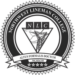 DM0000: The mark consists of the stylized letters and wording "NORTHWEST LINEMAN COLLEGE N L C ALTUS FORMALIS DOCTUM MCMXCIII M H P D H" and design. The design consists of several concentric circles. The outer most circle has a scalloped edge. The two inner most circles are much smaller than the outer circles and within the space created between the inner circles and the outer circles is the wording "NORTHWEST LINEMAN COLLEGE" that curves above the inner two circles. Centered within all of the circles is an inverted triangle and within the triangle is a stylized design of a power pole. Above the power pole are the letters "N" "L" and "C" in separate boxes superimposed on the top line of the triangle. A banner is superimposed across the bottom portion of the circles and it includes the wording "ALTUS FORMALIS DOCTUM" above a smaller banner including the Latin numeric date "MCMXCIII" which is placed above five stars and each star contains one of the letters "M" "H" "P" "D" "H".