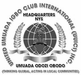DM0000: The mark consists of a woman wearing a head wrap and off the shoulder shirt with a necklace over a globe design. The woman appears carrying a unifying pot. A banner appears under the globe and a wheat shaft on both sides. The wording "UNITED UMUADA IGBO CLUB INTERNATIONAL (UUICI) INC." appears arched above with the wording "HEADQUARTERS NYS" between the arched wording and globe. The wording "UMUADA ODOZIE OBODO (THINKING GLOBAL, ACTING IN LOCAL COMMUNITIES)" appears written on two lines at the bottom. The entire wording appears written in stylized lettering with a drop shadow.