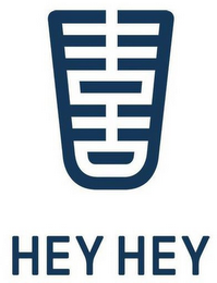 - DM0000: The mark consists of a dark blue quadrilateral that is wider at the top than the bottom, has curved corners at the bottom, is incomplete at the top middle, and which contains, from top to bottom, two horizontal lines that are incomplete in the middle, a horizontal line that is centered in the middle of the quadrilateral, two horizontal lines that are incomplete in the middle, and another horizontal line that is centered in the middle of the quadrilateral. Below the quadrilateral is the dark blue stylized wording "HEY HEY".