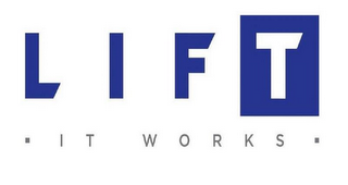 - DM0000: The mark consists of the wording "LIFT" in stylized text with the letters "LIF" in blue above the wording "IT WORKS" in gray. A square, in gray, appears to the left of the wording "IT". A similar square, in gray, appears to the right of the wording "WORKS". A blue box appears around the letter "T" in the wording "LIFT". The letter "T" in the wording "LIFT" appears in white.