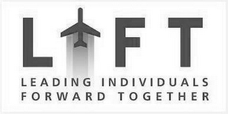 DM0000: The mark consists of the word "LIFT" with the letter "I" shown in stylized form as a jet flying upwards with contrails behind it. Below the word "LIFT" the words "LEADING INDIVIDUALS" appear above the words "FORWARD TOGETHER".