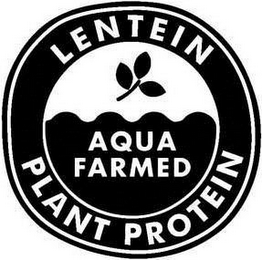 DM0000: The mark consists of a stylized circular design, with an outer shaded rim, an unshaded circular line within the rim, and a thicker shaded circular portion within that, inside of which is the unshaded wording "LENTEIN PLANT PROTEIN", with "LENTEIN" on top and "PLANT PROTEIN" on the bottom. The innermost portion of the circular design is a mostly unshaded circle featuring an unshaded portion with a top that resembles wavy water. Above the wavy portion is a stylized branch with three leaves, and inside of the shaded portion is the unshaded literal element "AQUA FARMED".