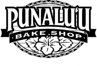 - DM0000: The mark consists of an oval with a stylized basket weave border and horizontal lines in the background, containing "PUNALU'U" overlaid over the oval and "BAKE SHOP" in a banner beneath "PUNALU'U" with dots on either side of "BAKE SHOP", and a hibiscus flower and leaves beneath the banner.
