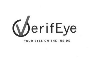 DM0000: The mark consists of a broken circle with the letter "V" in the appearance of a checkmark image inside the broken circle wherein the right vertical line of the "V" extends up and out to the right and longer than the left side vertical line of the "V" followed by the letters "ERIFEYE" with the "ERIF" in lower case, the "E" in upper case and the "YE" in lower case, and the words "YOUR EYES ON THE INSIDE" below.