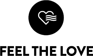 - DM0000: The mark consists of a design consisting of an outline of a heart that is incomplete on the right side. On this incomplete side are three wavy lines that start from the inside of the heart and towards the right. This entire design appears within a shaded circle, which is above the stylized wording "FEEL THE LOVE".