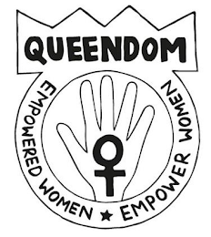 DM0000: The mark consists of two concentric circles with a hand design bearing a venus-gender symbol in the center circle, and with the wording "EMPOWERED WOMEN EMPOWER WOMEN", with a five point star between "WOMEN" and "EMPOWER", appearing between the two circles, with a rectangular crown design comprising the top of the outer circle and the word "QUEENDOM" in the center of the rectangular crown design.