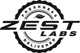 DM0000: The mark consists of a round seal with a pie-crust crimped outer rim and an inner rim with short rays extending radially therefrom. The word "ZEST" extends through the seal with the word "LABS" below and to the right. The word "FRESHNESS" appears in the upper arc of the seal and the word "DELIVERED" appears in the lower arc of the seal. A leaf appears within the inner rim of the seal above the word "ZEST".